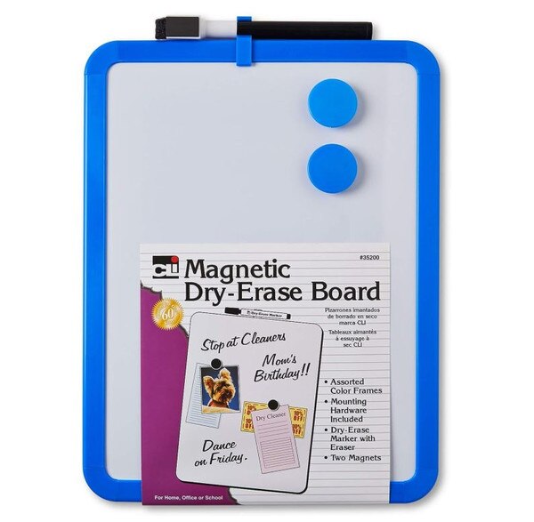 Dry Erase Board Magnetic With Magnets CLi 8.5X11 SKU Dry Erase Board Magnetic With Magnets CLi 8.5X11 $5.49 Quantity discounts available QuantityPrice (0) No Reviews yet Quantity -+ Add to Cart Details Magnetic dry-erase boardAssorted color framesMounting hardware includedDry-erase marker with eraserTwo magnetsMeasures approx. 11.25 x 8.5 inches DetailsBackDetailsMagnetic dry-erase boardAssorted color framesMounting hardware includedDry-erase marker with eraserTwo magnetsMeasures approx. 11.25 x 8.5 inches Ratings & ReviewsNo reviews availableBe the first to Write a Review