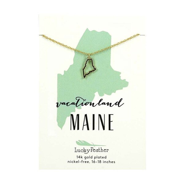 Vacationland, Maine. Wear your pride with this 14k gold dipped Maine state necklace. Easily adjustable from 16-18" in length and packaged on a stylish and colorful card with the state silhouette. Now you can enjoy the vacation in style!