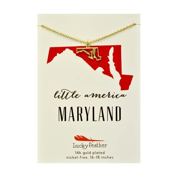Little America, Maryland. Wear your pride with this 14k gold dipped Maryland state necklace. Easily adjustable from 16-18" in length and packaged on a stylish and colorful card with the state silhouette. Now you can enjoy Maryland in style!